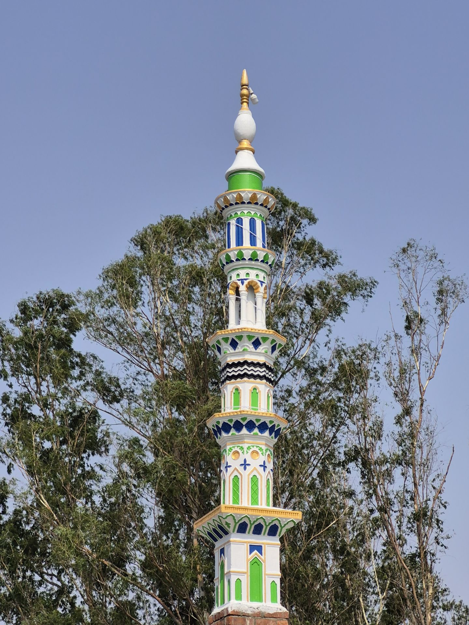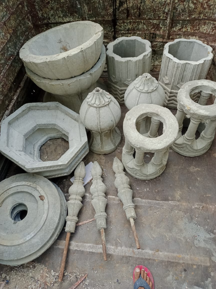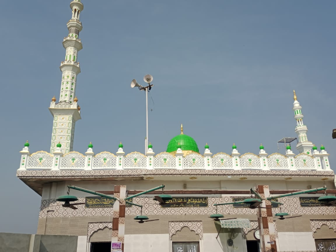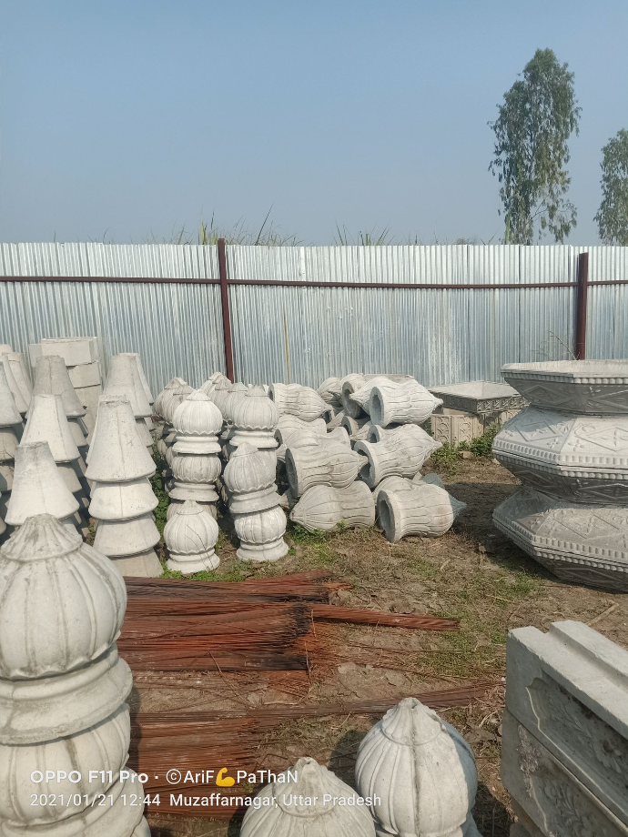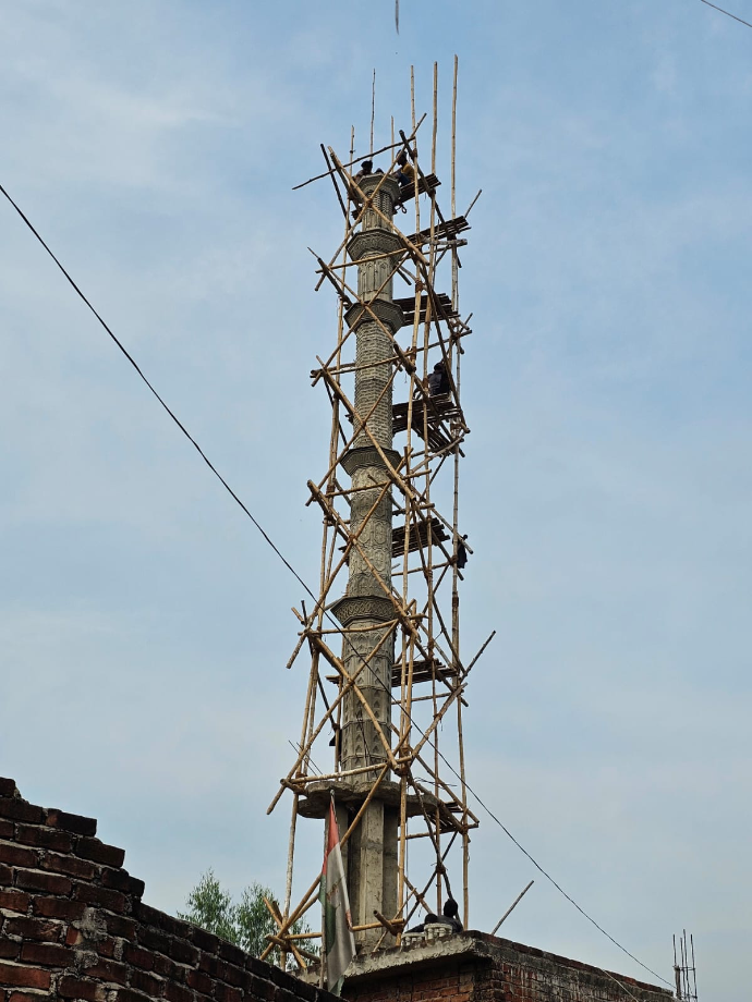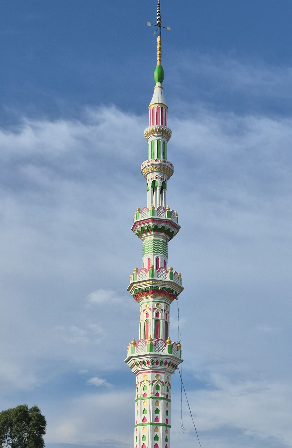 This is a ready-made minaret constructed from pre-fabricated blocks. Concrete, cement, and rebar are used to cast the blocks. These are manufactured in separate parts and then assembled and fitted onto the mosque. The blocks have an external design and a hollow core. Rebar, such as 12 mm or 16 mm, is inserted into the core. The pieces are then stacked one on top of the other, and the entire structure is cast. After the minaret is complete, the joints are repaired, and then it is painted. First, a plastic primer is applied, followed by a plastic paint, and then the final color. The minaret also has an option for lighting; the mosque authorities can have lights installed if they wish. Minarets can be built from 5 feet to 70 feet in height, and we have built them in this range. For more information, you can call the number provided. The minaret construction is completed within a week, depending on the size of the minaret.